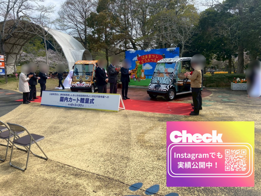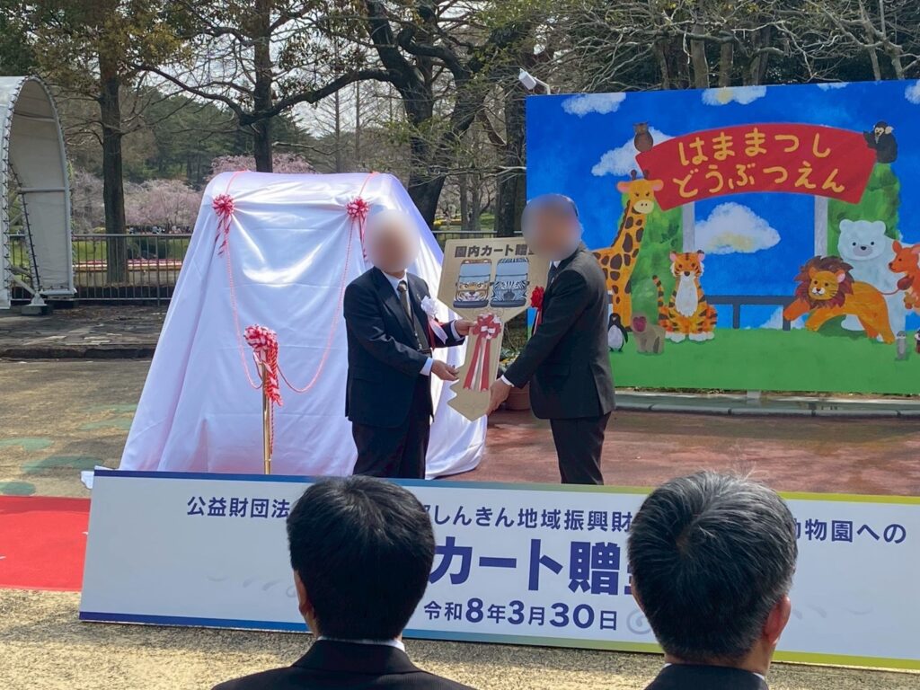 公益財団法人 静岡県西部しんきん地域振興財団様より浜松市動物園様へ、園内カートの贈呈式が行われ、弊社は当イベントにおける「カーラッピングデザイン」「式典装飾」「除幕」などを弊社が担当しました。