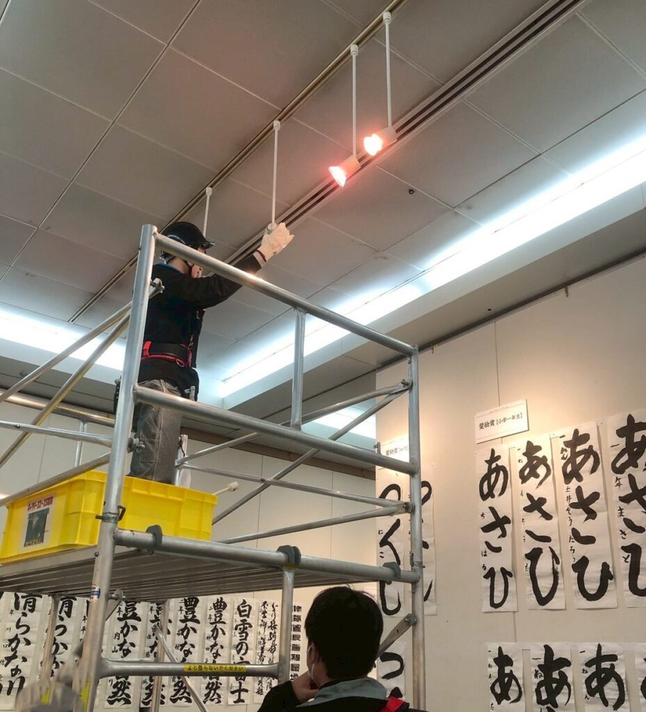 掲示された作品たちが輝いて見えるように、100台ある照明の角度を1つずつ調節いたしました。