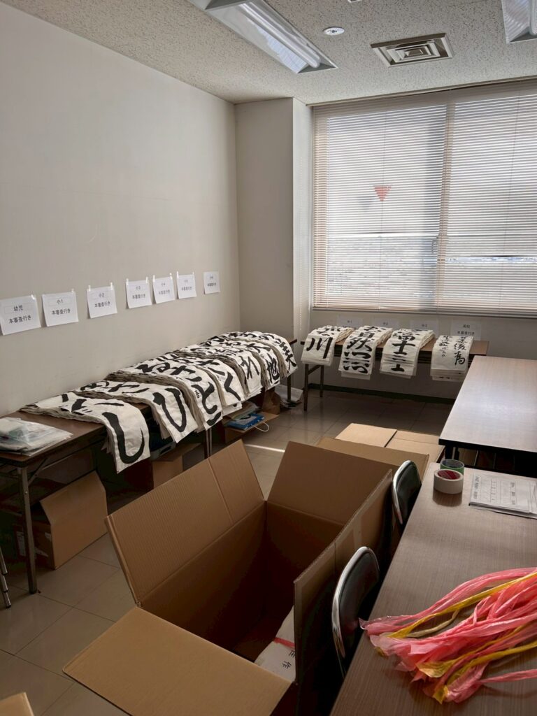 前年までは書初め作品の掲示業務のみを担当しておりましたが、本年度より掲示に加え、運営面にも携わらせていただきました。